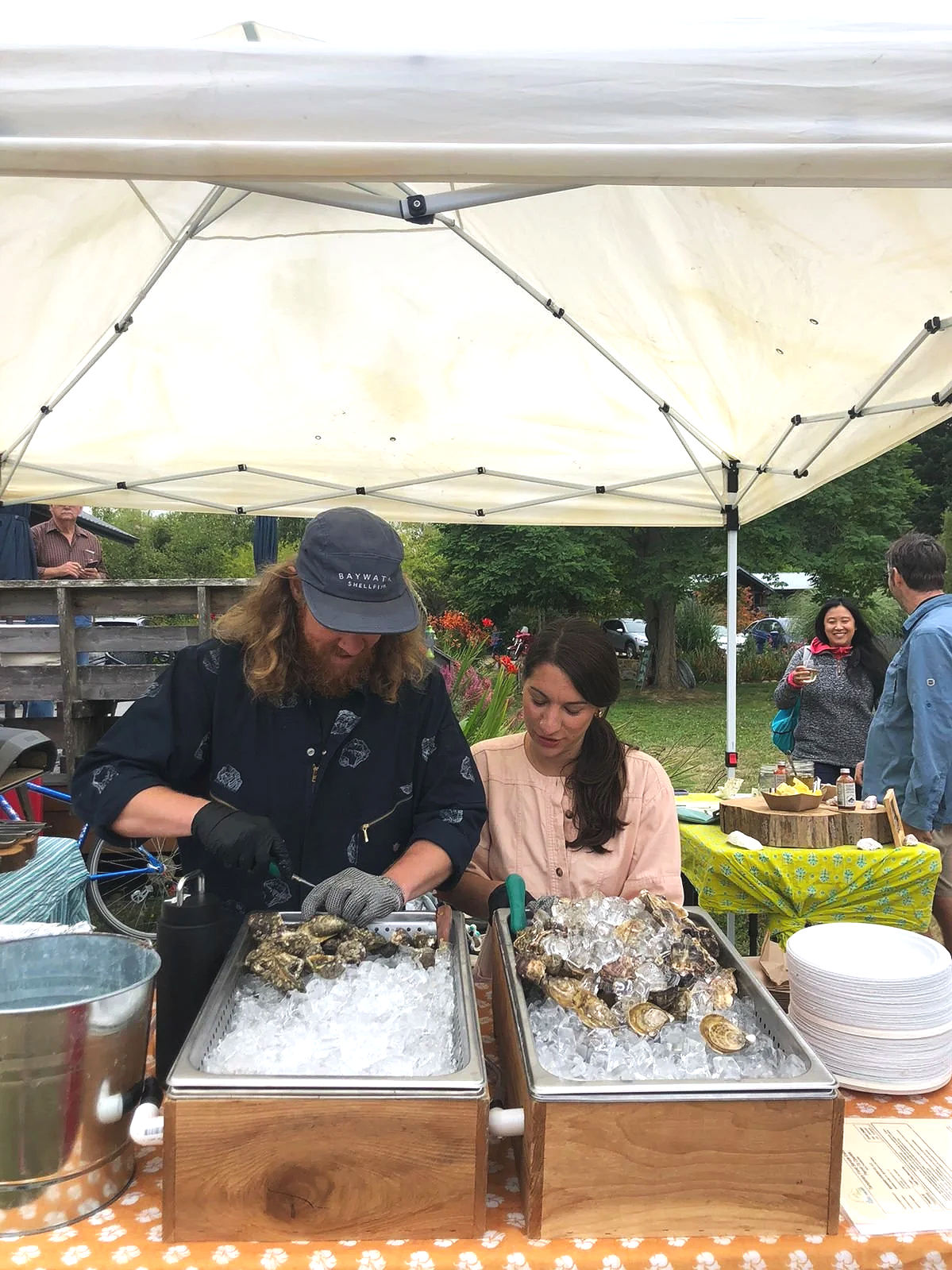 Two-thirds of us shucking Baywater Indigos at Marrowstone Vineyards